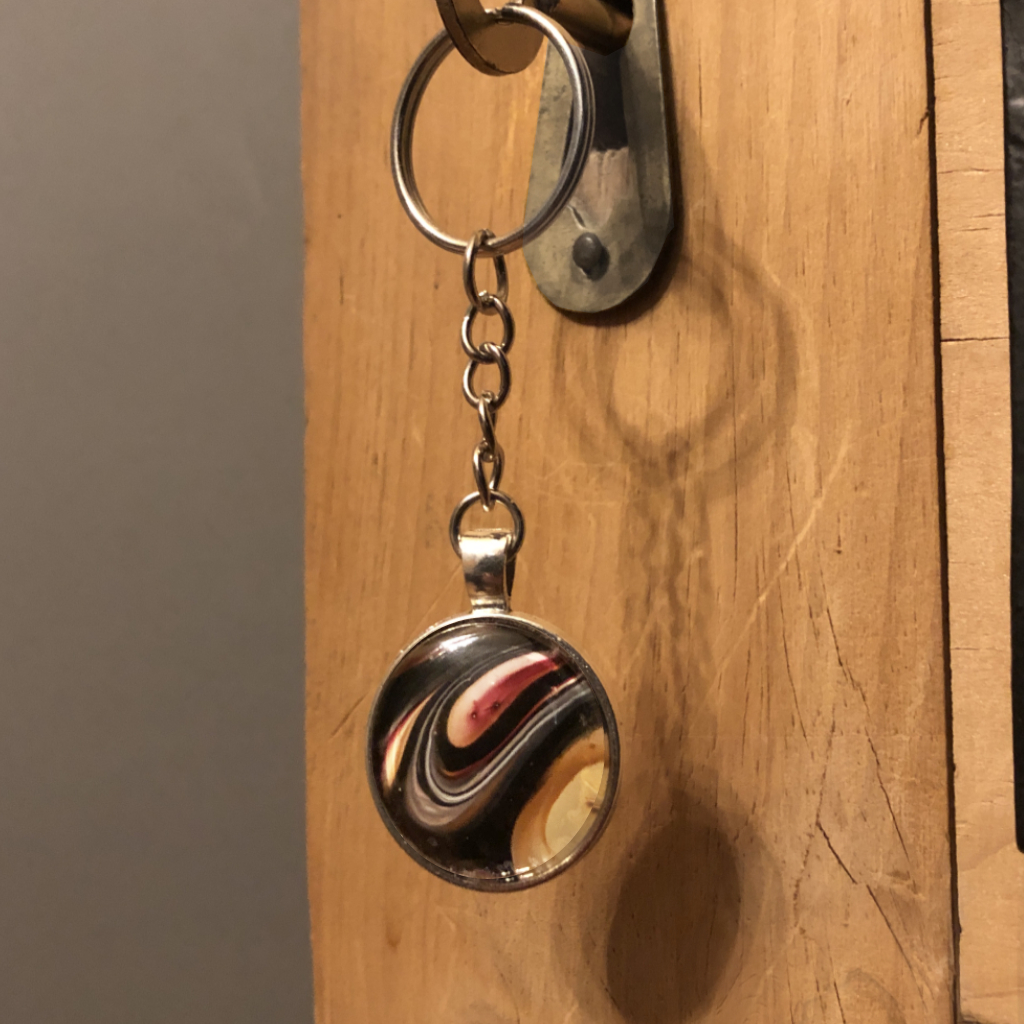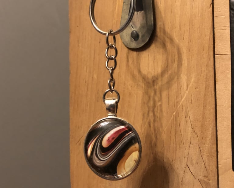 Handcrafted using recycled paint, these unique keyrings showcase mesmerising abstract fluid art designs, encased in smooth glass. Each piece is a miniature work of art, blending sustainability with striking aesthetics.