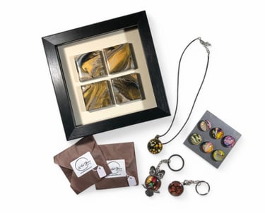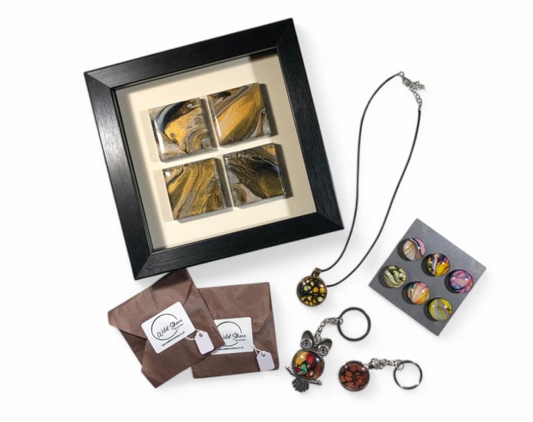 Explore our collection of handcrafted pieces, including framed fluid art, glass pendants, earrings, rings, keyrings and magnets. Our framed art is created on ceramic tiles and finished with a protective resin coating, while our smaller accessories are made using recycled paint, carefully encased in glass. Each piece is truly one of a kind.