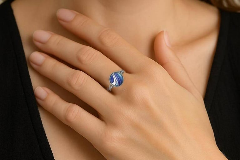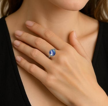 Each handcrafted ring showcases a striking abstract fluid art design, made using recycled paint and set beneath a smooth glass dome. These unique, sustainable pieces combine bold artistry with timeless style, making every ring a miniature work of wearable art.