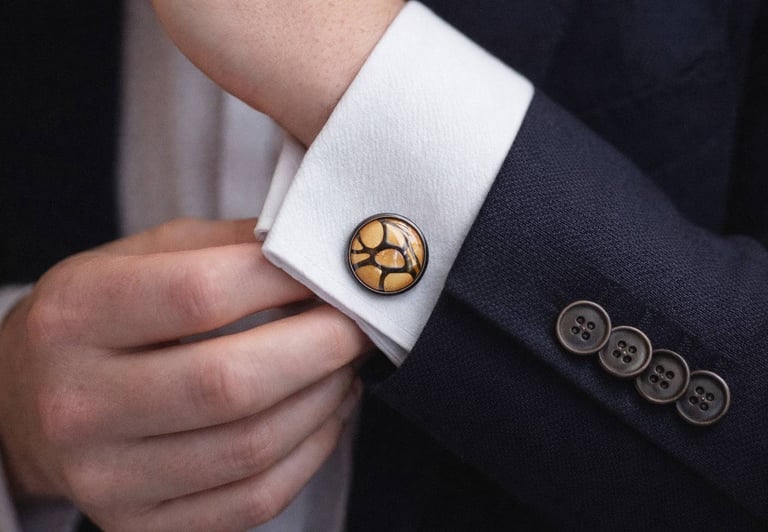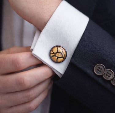 Distinctive and elegant, these handcrafted cufflinks showcase miniature abstract art encased in smooth glass. Each pair is a tiny masterpiece, combining unique patterns and colours to add a sophisticated, artistic touch to any formal outfit.